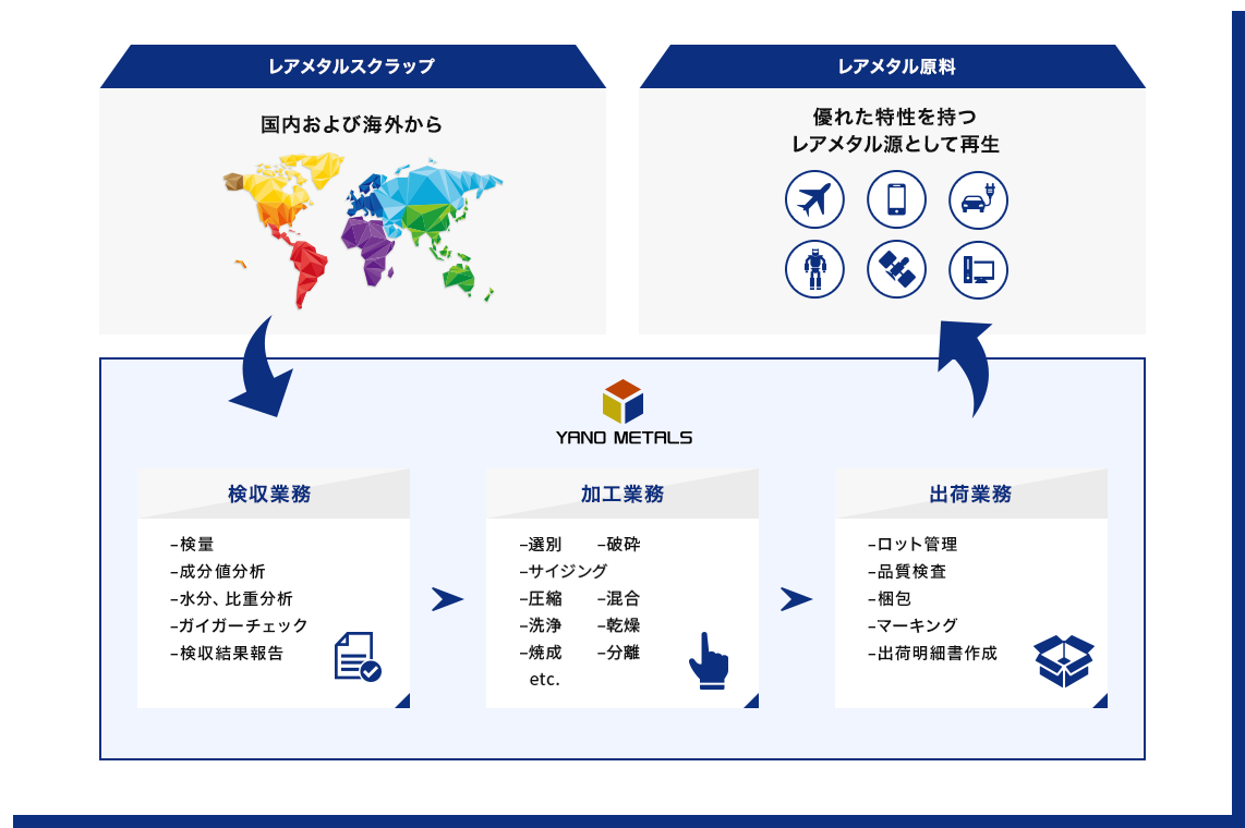 レアメタルに関する幅広い知識を駆使し、省エネルギーを意識した加工技術を用いて、集荷・分析・検査・加工・出荷までの一貫したオペレーションを行います。